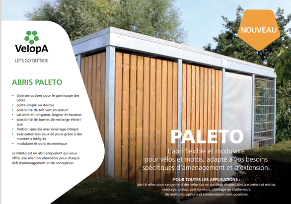 Caractéristiques:Le Paleto est un abri à vélos pour rangement des vélos sur un ou deux étages, abri à scooters et motos, stockage e matériel, préau, abri fumeurs, stockage de conteneurs.